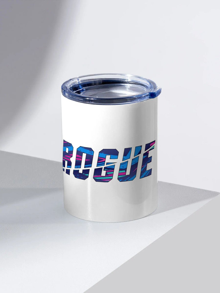 10oz stainless steel tumbler with bold Rogue design in blue, pink, and teal. Keeps beverages at perfect temperature for hours and is dishwasher-safe.